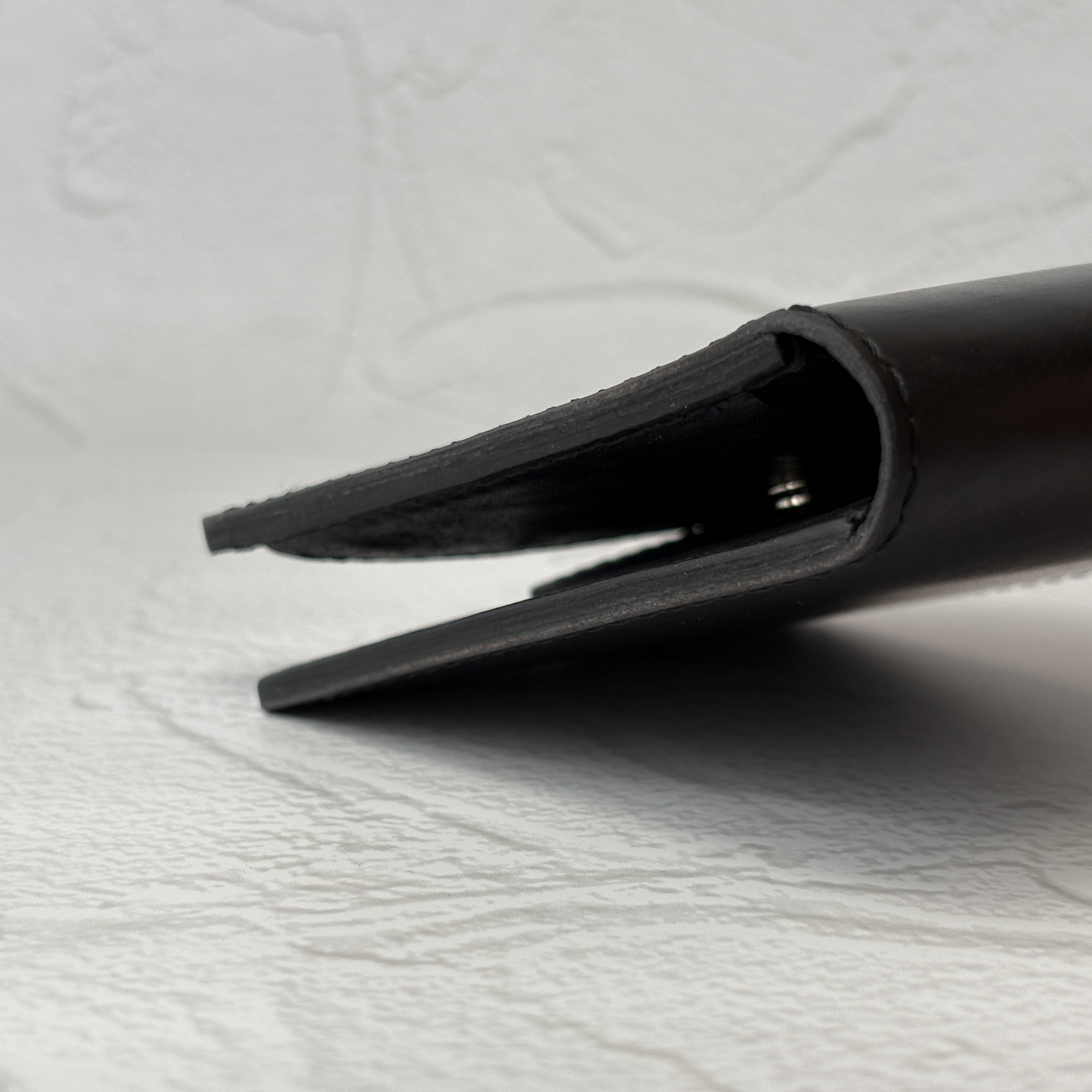 ゴム製の塗料を塗ってコバを隠さず、やすりがけと磨きを何度も繰り返しながら整える製法です。