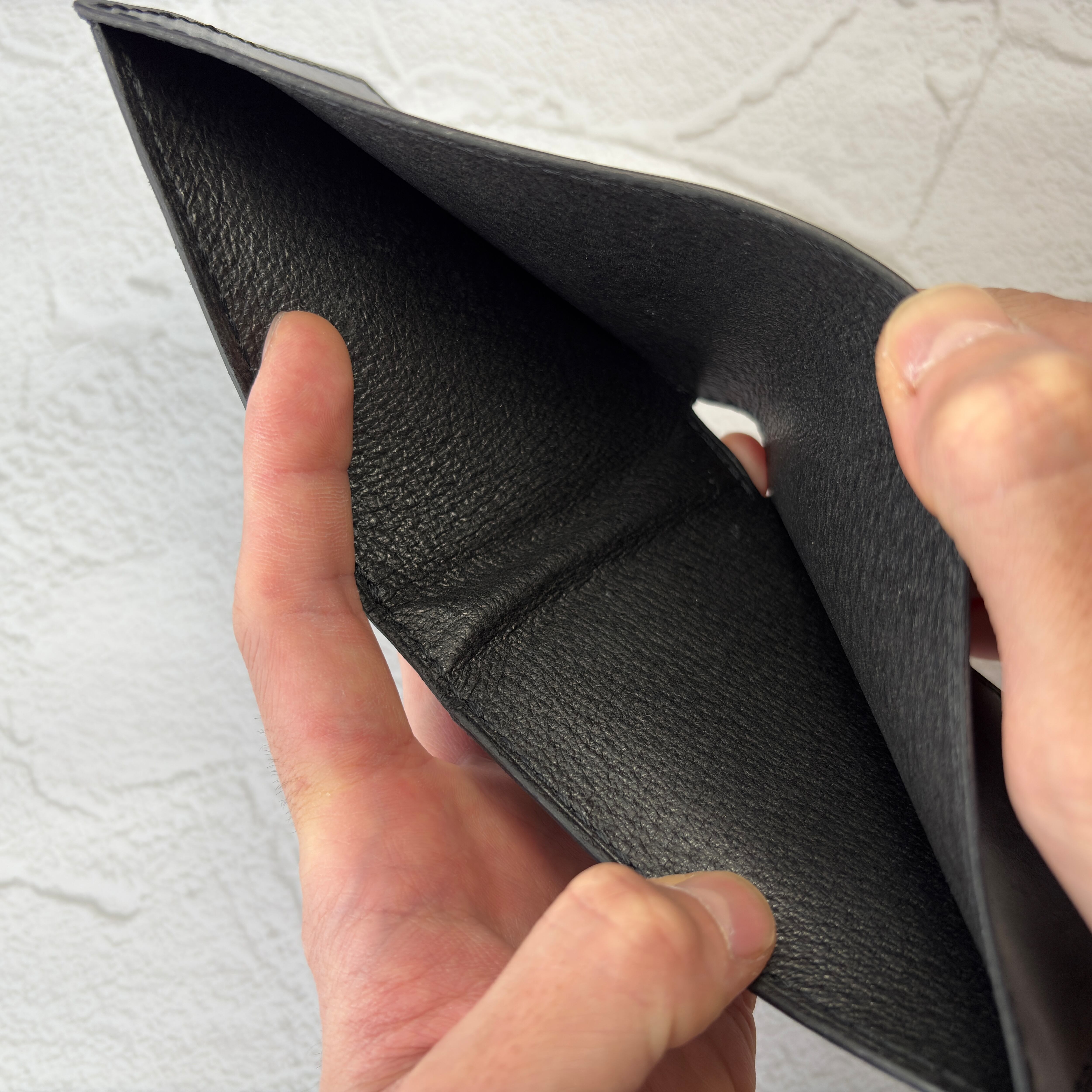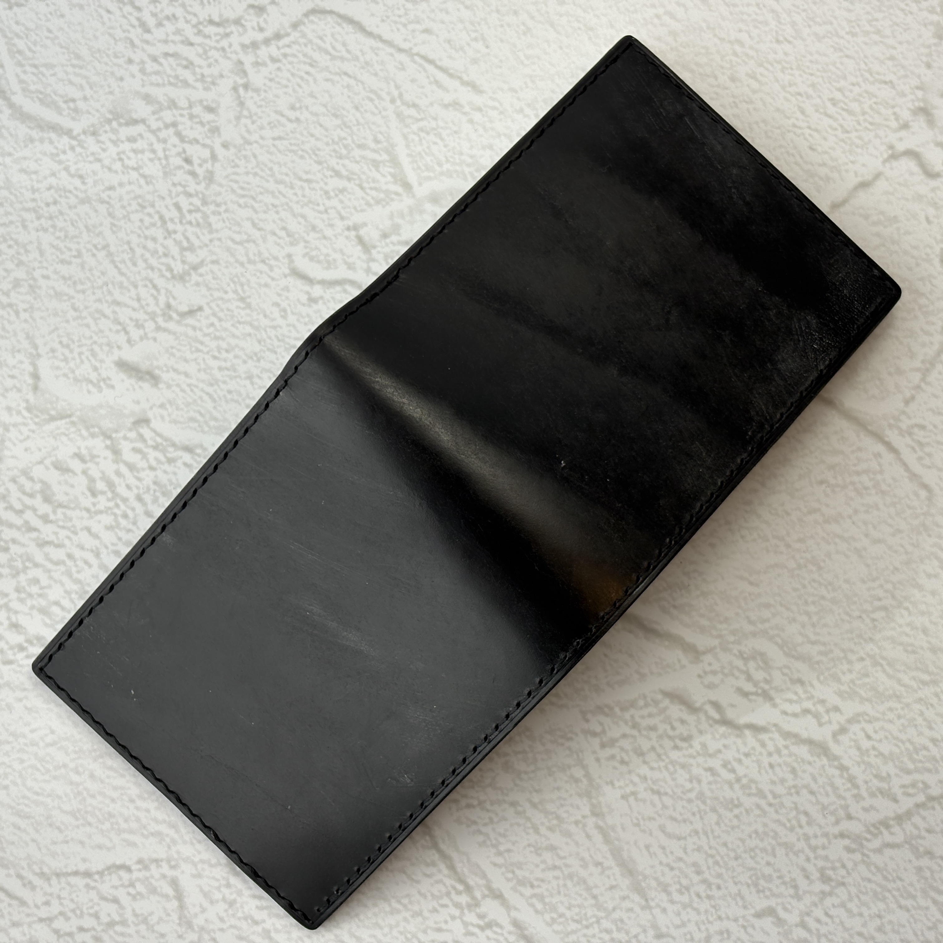 黒一色にこだわる人のために仕立てた、ロゴや装飾が一切ないオールブラック・オールレザーの二つ折り財布。